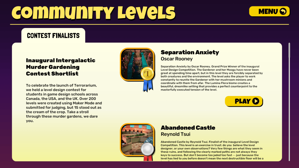 The community designed levels are nothing to shake a stick at. Not as simple as the first chapter of the campaign for sure. There’s some amazing ideas and designs that have been done, definitely recommend checking them out after you’ve got a good knowledge base of the game and controls and hazards in your mind.