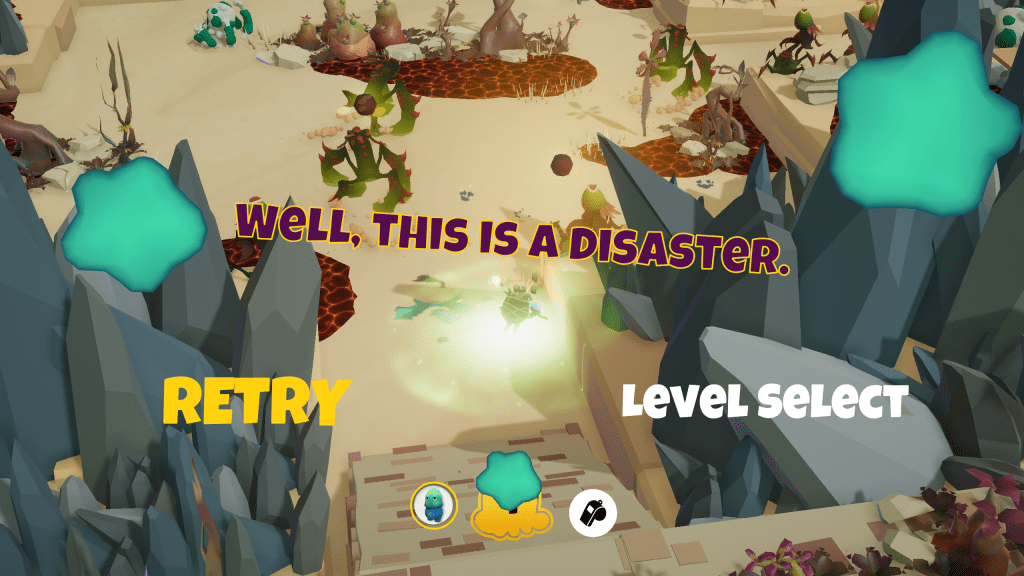 Terrorarium comes with three modes, the campaign, creator levels designed by other players & creative where you can make your own levels for others. I started out by popping into the settings. The UI is very simplistic, but it can be easy to miss things. I went straight for the sound settings, and there really isn’t any outside off and on which is unfortunate. The controls are quite basic which is nice for a puzzle platformer, I’m going to need all the brain power I can get for figuring my way through the levels.